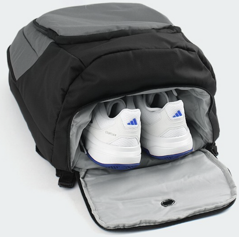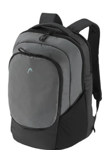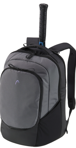 The HEAD Pro X Tennis Backpack (30L). It holds up to two racquets in a padded compartment with zip-stop zippers, plus a main compartment with a padded laptop/tablet sleeve. A front pocket organizes small items, a vented bottom compartment stores shoes or dirty gear, and an adjustable side pocket fits a water bottle or balls. Padded, adjustable straps ensure comfortable carrying.